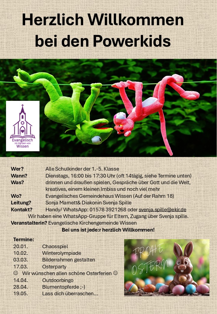 Für alle 7-11 jährigen Kinder gibt es jetzt die Powerkids. Auch hier geht es künftig im 14tägigem Rhythmus ein tolles Programm, wie z.B. Spiele, Gespräche über Gott und die Welt, Kreatives, Imbiss und vieles mehr. Termine und Programm findet ihr hier